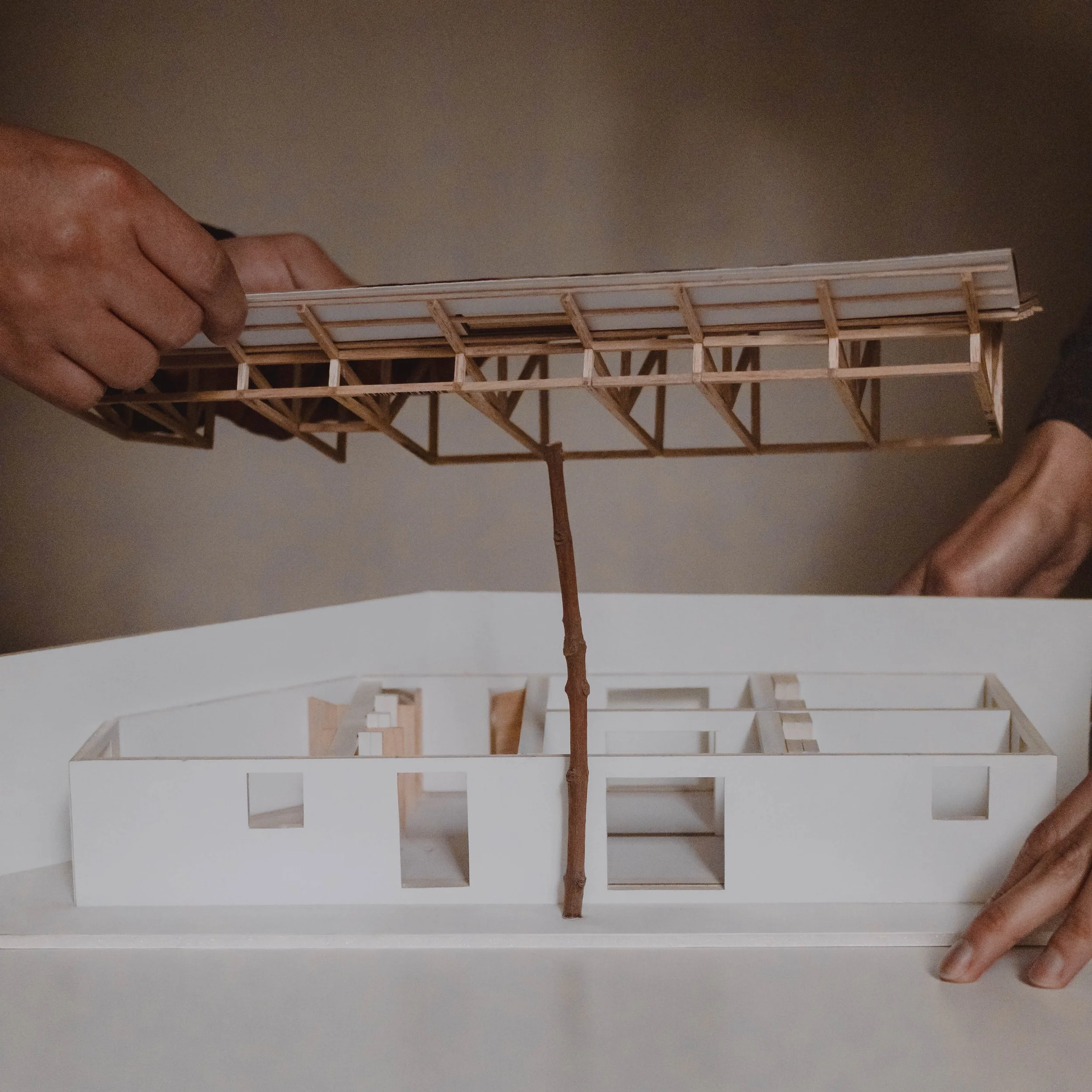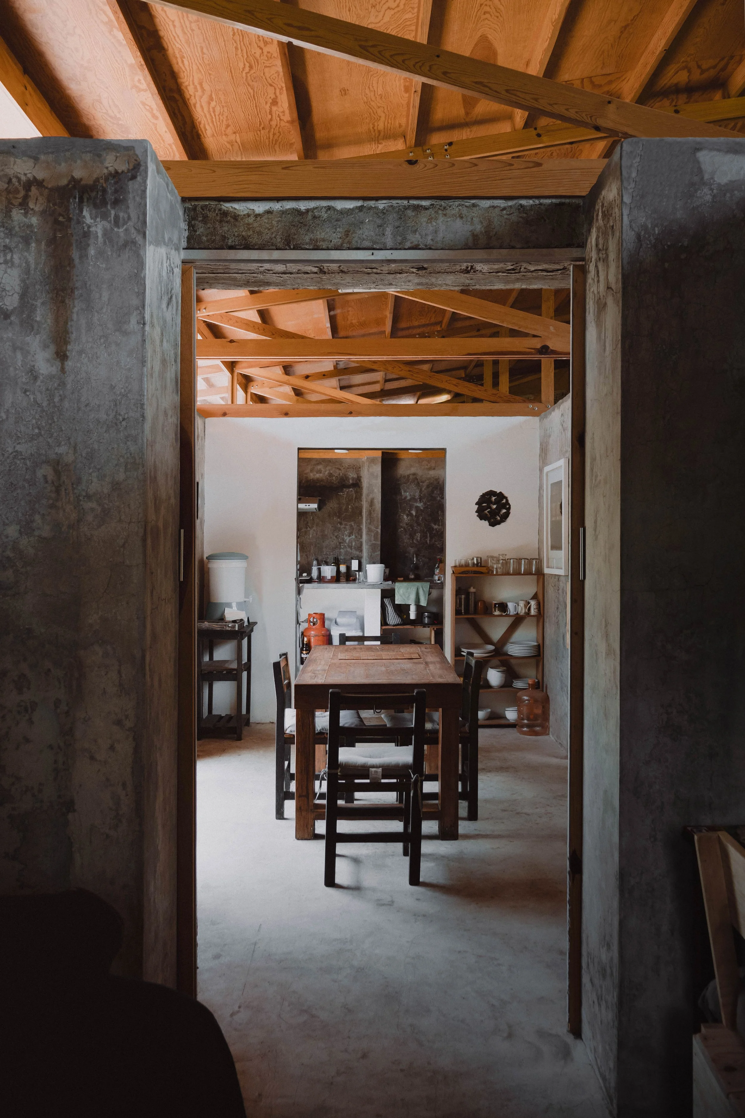 Diseñamos una intervención simple con una cubierta inclinada de madera ensamblada que el artista Rafael Ruiz y el taller de carpintería de La Ceiba construirían con sus propias manos. La estrategia: transformar las antiguas celdas en habitaciones libres y cubrirlas dejando entrar la luz.