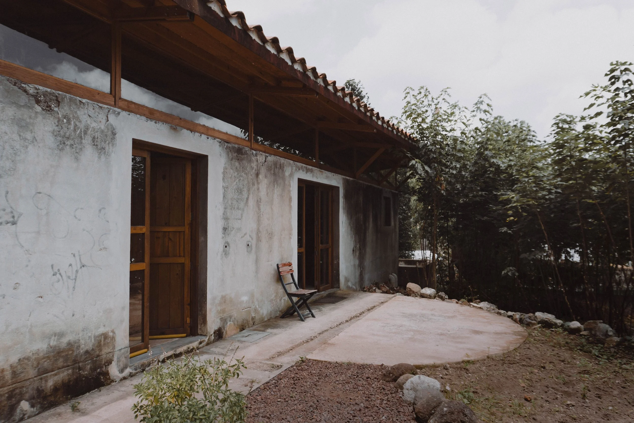 Una cuba horizontal de lavado de café en las ruinas del antiguo beneficio de La Orduña. Varias celdas comunicantes a cielo abierto, apenas 2.10 metros de altura. La Ceiba Gráfica necesitaba convertir estas ruinas en espacio habitable para su comunidad de artistas.